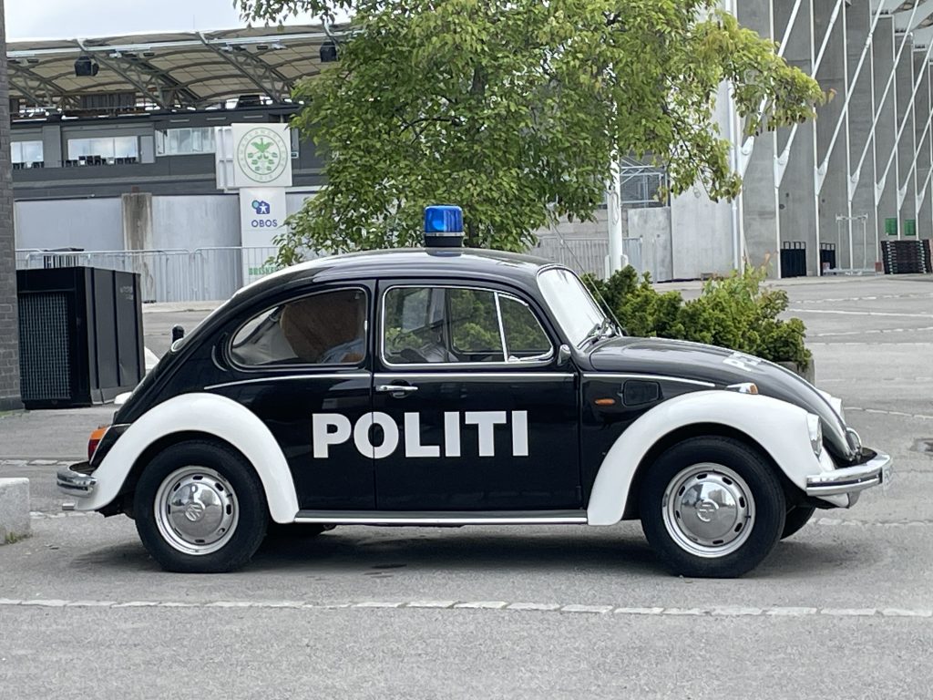 Vor dem ‚ Fußballstadion von Hamar dann zwei besondere Fundstücke. Vielleicht ist es ein Hinweis auf die niedrige Kriminalitätsstatistik, dass es noch den Käfer als Einsatzfahrzeug gibt.
