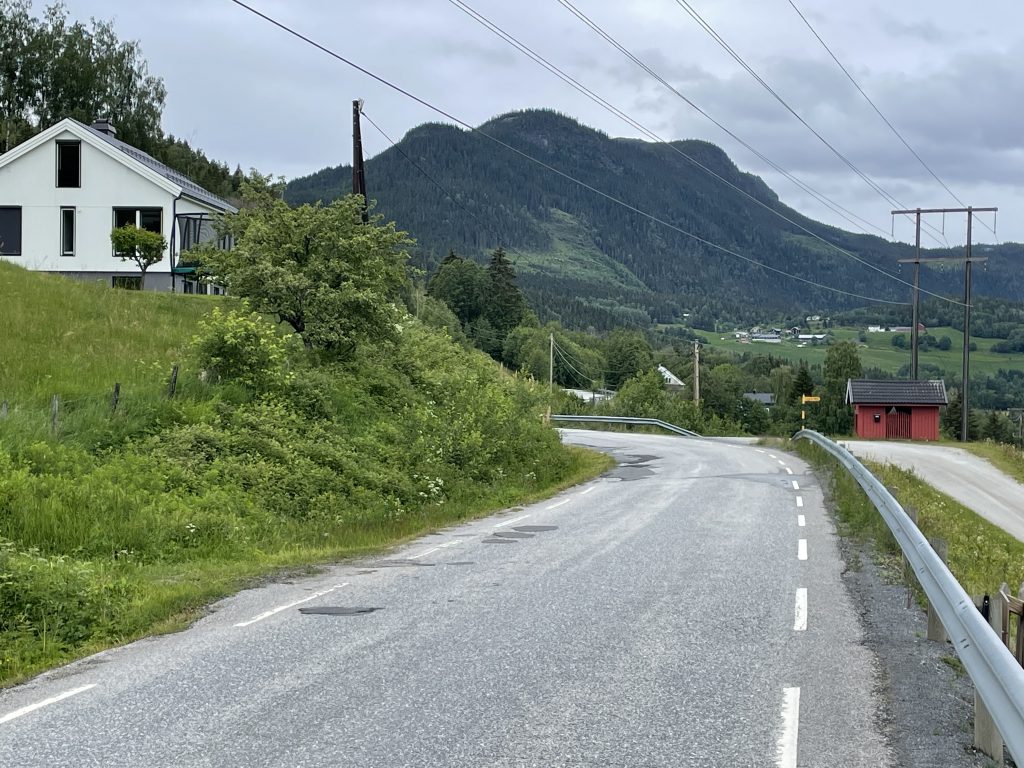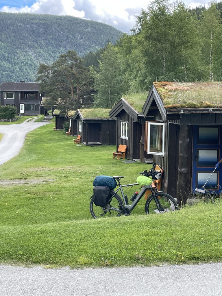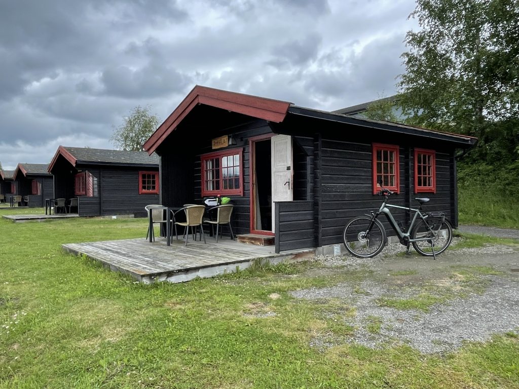 Es nieselte zwar noch leicht, aber die Vorhersage war besser, also startete ich am Vormittag nach Ringebu. Das sollte gar nicht so lang und auch nicht so schwer werden. Aber dann kam eine Tour, die mir alles abverlangte. Um das Fahren auf der E 6, der wesentlichen Hauptstraße durch Norwegen von Nord nach Süd (die inzwischen vielerorts als Autobahn ausgebaut ist, aber eben nicht hier), zu vermeiden, bot mir das Navigationssystem eine kleine Straße an, die ein wenig länger wäre. Das war sie auch, dass ich dabei den Berg quasi direkt hochfahren muss, war mir zumindest zunächst nicht klar. Und das nachdem ich zuvor schon wieder über 500 m aufwärts gefahren war. Beim Hochfahren verbrauchte der Motor so viel Strom, dass ich befürchten musste, den Akku vorfristig völlig leer zu fahren. Ich habe dann ein paar Höhenmeter schiebend verbracht – mit vollem Gepäck und bei Nieselregen. Aber auf der anderen Seite des Berges ging es auch wieder genauso steil abwärts. Das war besser als hoch, aber ich musste ständig bremsen und konnte so den kostenlosen Schwung gar nicht so gut nutzen. Am Ende des Umweges landete ich wieder auf der E6 und musste noch 5 km auf der Bundesstraße ohne echten Seitenstreifen und bei ständigem Schwerlastverkehr fahren.