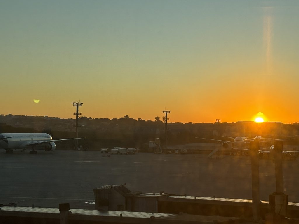 Jetzt erstmal Morgentoilette, Einreise und kleines Frühstück, bevor es mit dem nächsten Flieger weitergeht.