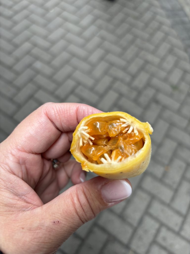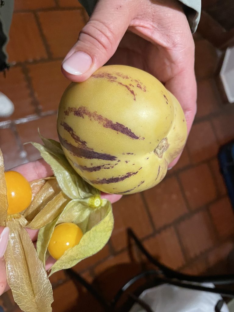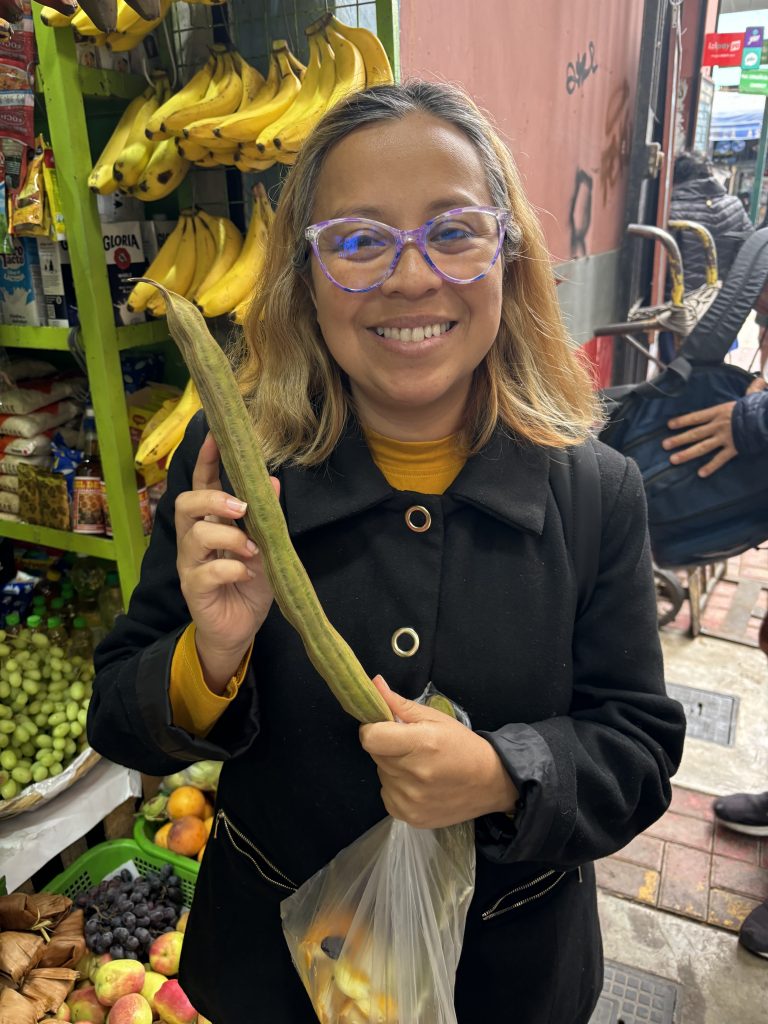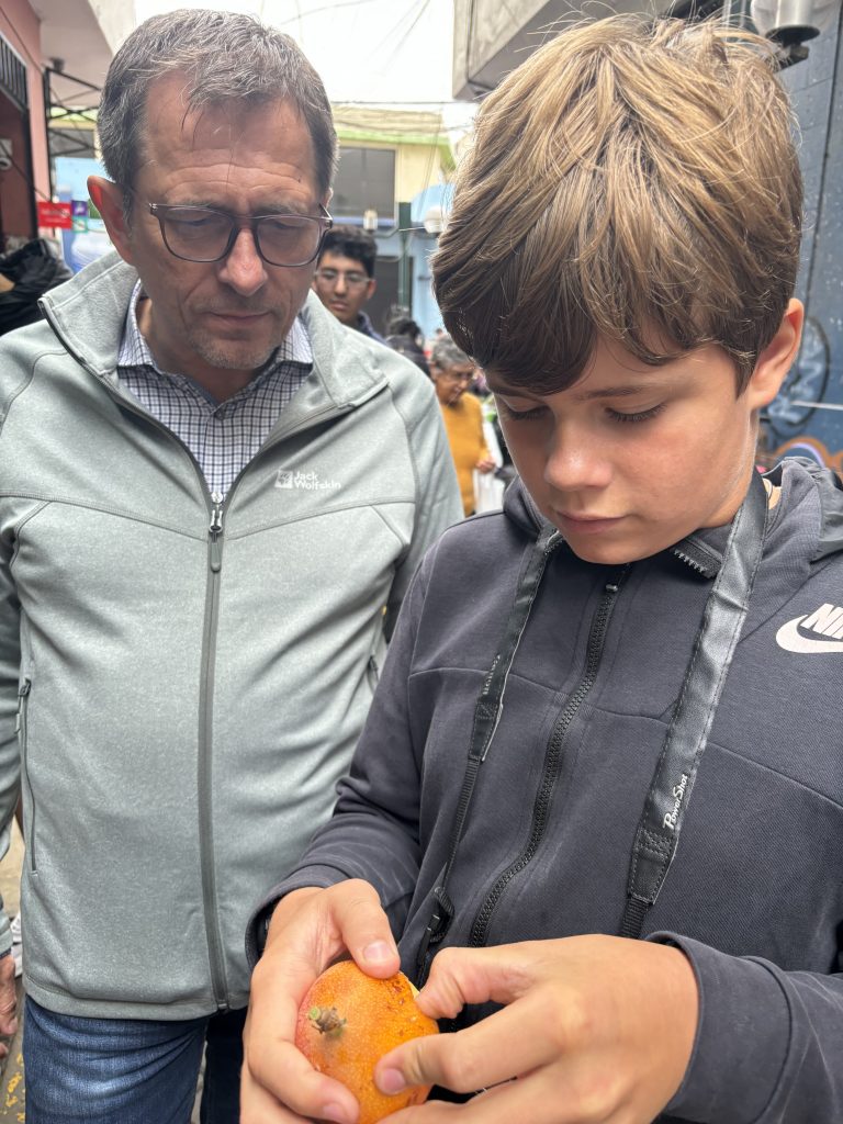 Nun durften wir selber allerlei Neues probieren. Nein, das ist keine Gurke, sondern eine Art Maracuya. Die Früchte sind überwiegend noch aus präkolumbianischer Zeit bekannt.