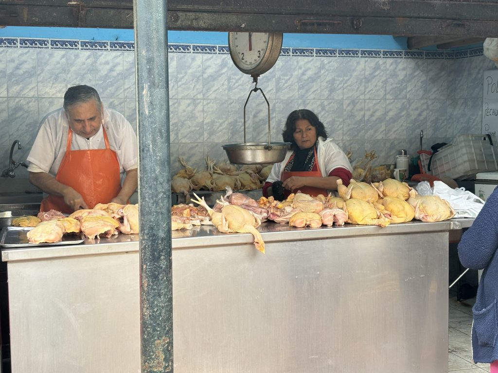 Hähnchen sind das liebste Fleisch der Peruaner. Hier auf dem Markt haben die Hühner noch Füße und einen Kopf. Man kauft ganze Hühner für ungefähr 4€. Das wird dann in 8 Teile zerteilt (inkl. Füße und Kopf versteht sich).