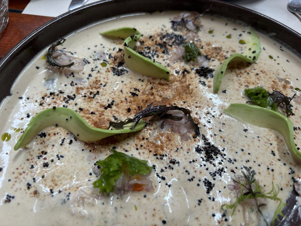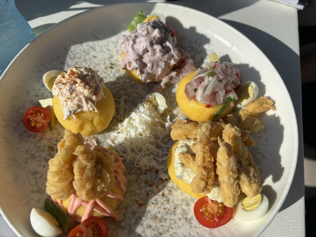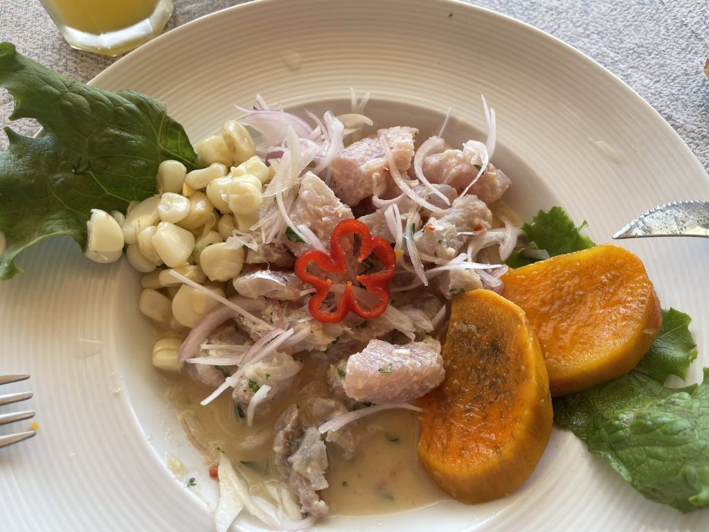 Cerviche, Nationalgericht Perus: frischer Fisch wird mit vornehmlich Limettensaft fermentiert. Inzwischen gern dazu auch andere Säfte wie Mango. Dazu Zwiebeln, weißer Mais und Süsskartoffel Scheiben. Kaltes Gericht und saulecker. Aus der Not heraus: Fischer waren lange auf dem Meer und konnten nichts braten oder kochen.