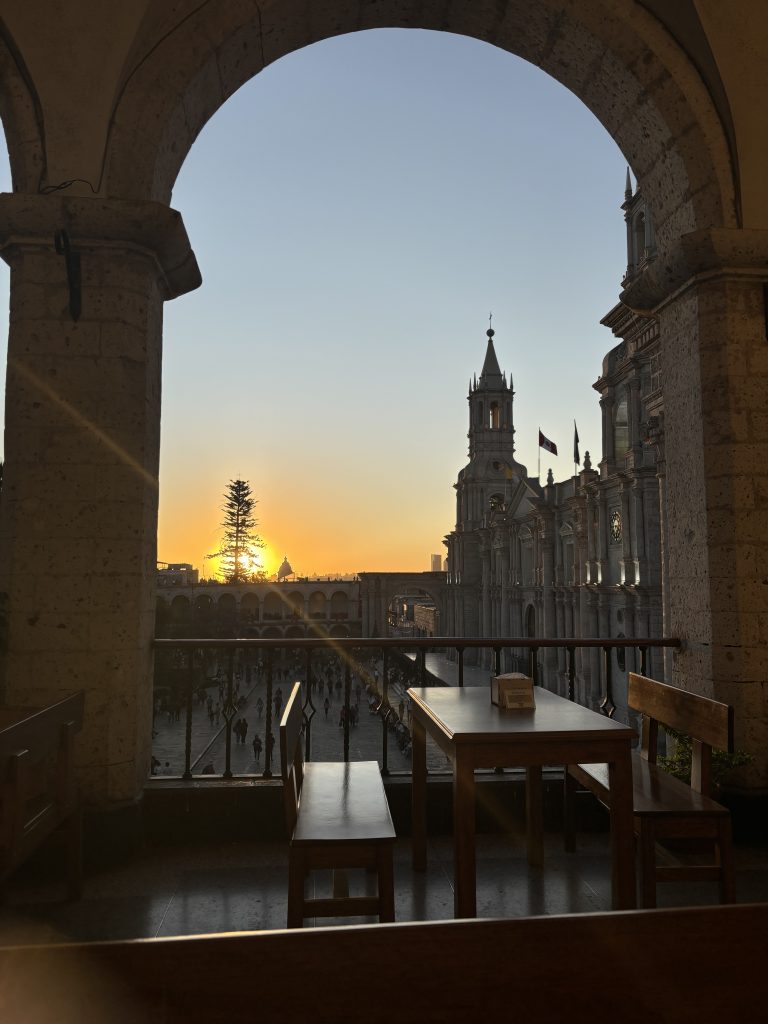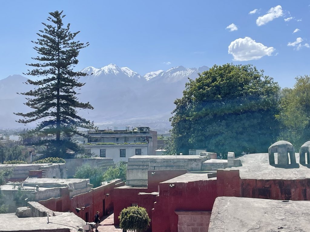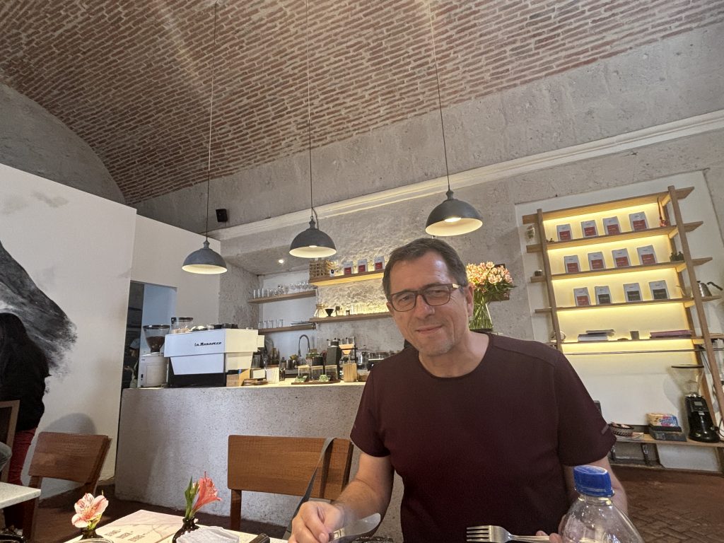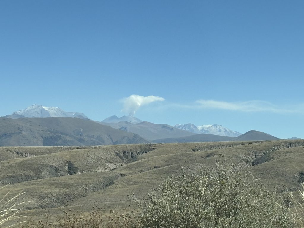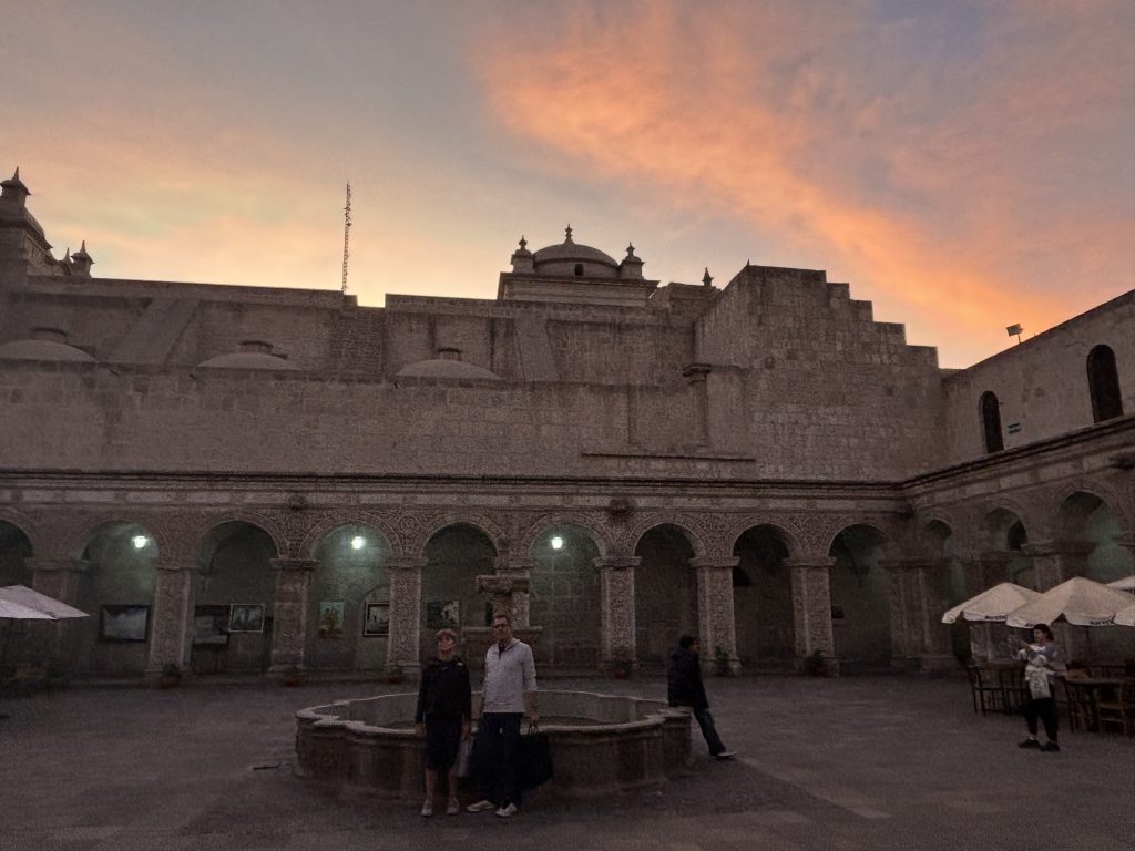 Über Nacht sind wir mit dem Luxusbus in die Berge nach Arequipa auf etwa 2.300 m Höhe gefahren. Das waren 13 Stunden Busfahrt, von denen wir die meisten fast liegend schlafend verbracht haben. Trotzdem waren wir nach der Ankunft nicht völlig erholt. Der erste Blick auf die Landschaft und auf unser wunderschönes Hotel aus der Kolonialzeit sowie ein leckeres Frühstück haben unsere Stimmung noch weiter befördert.