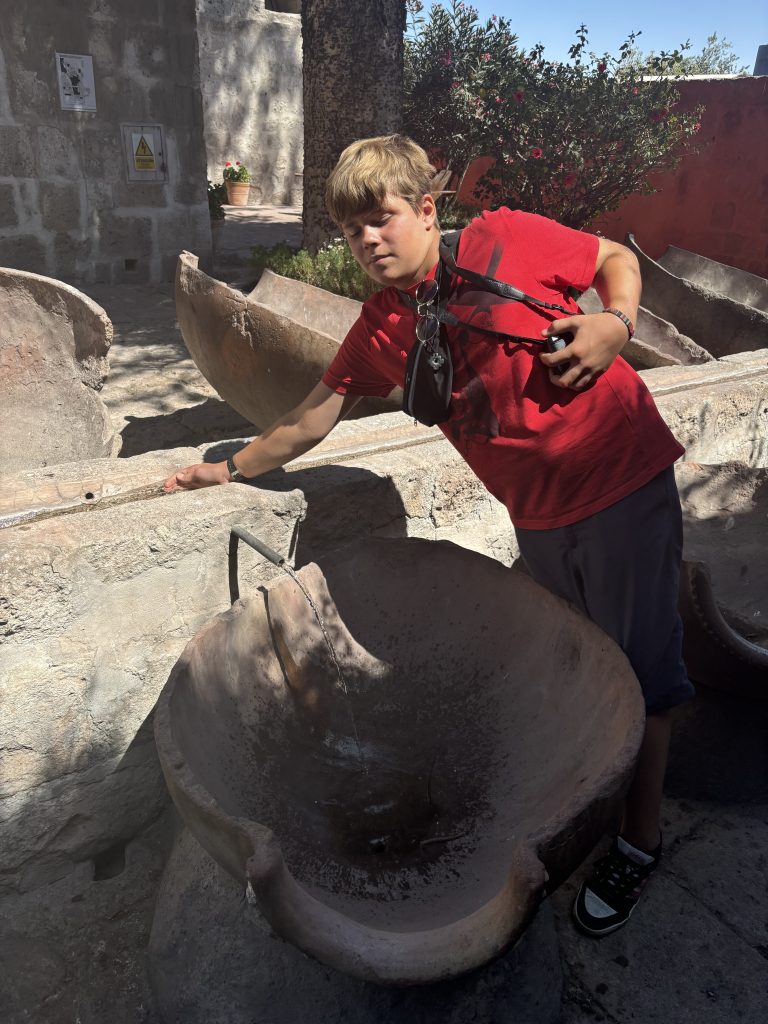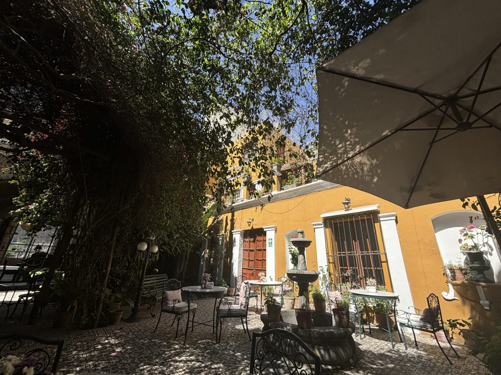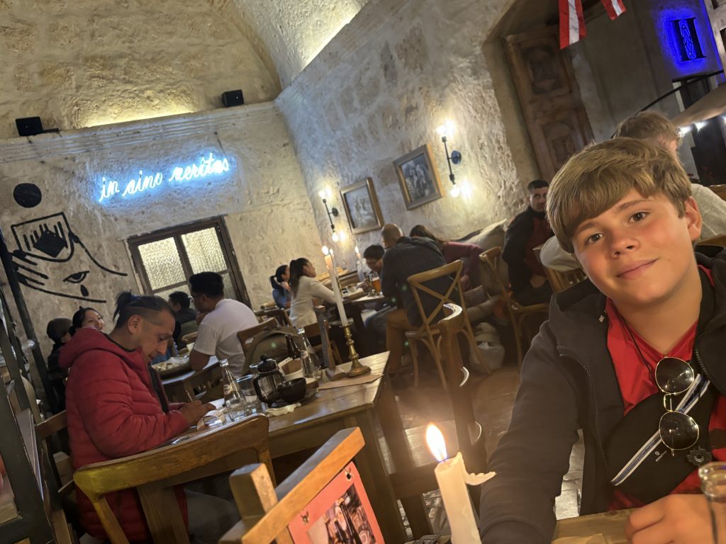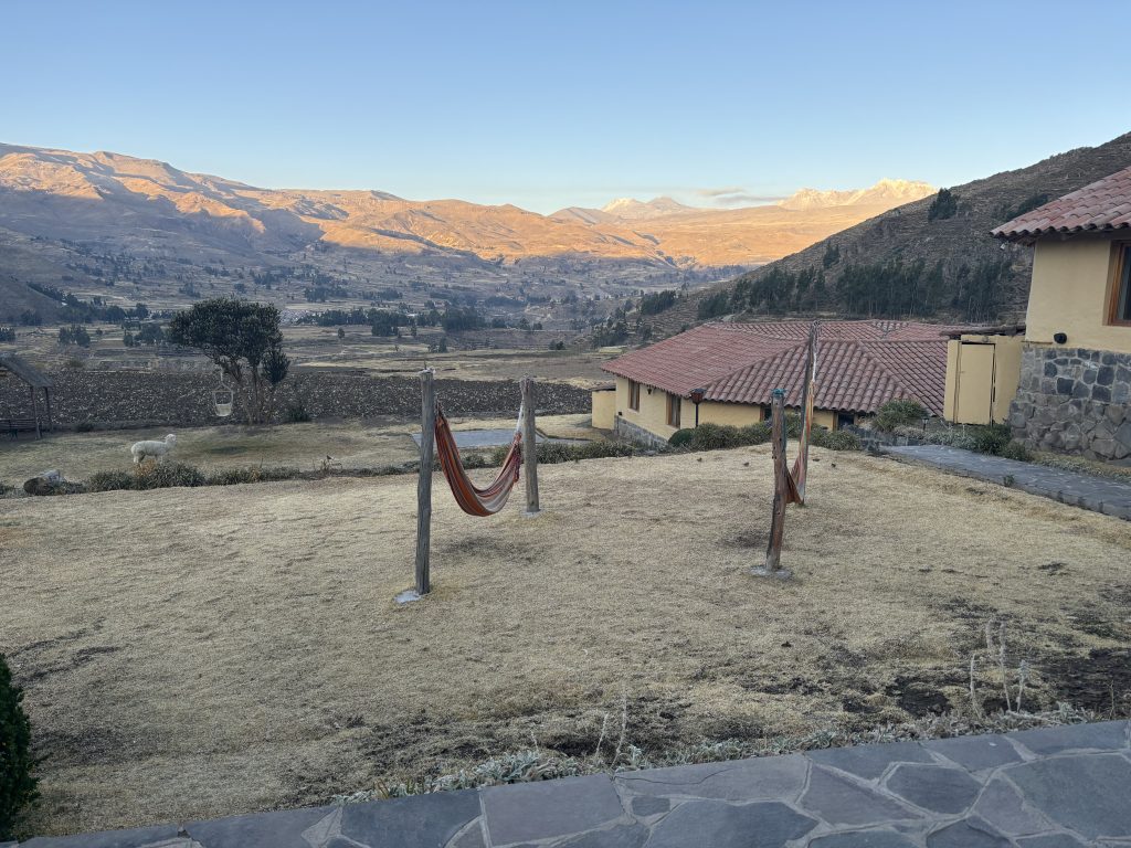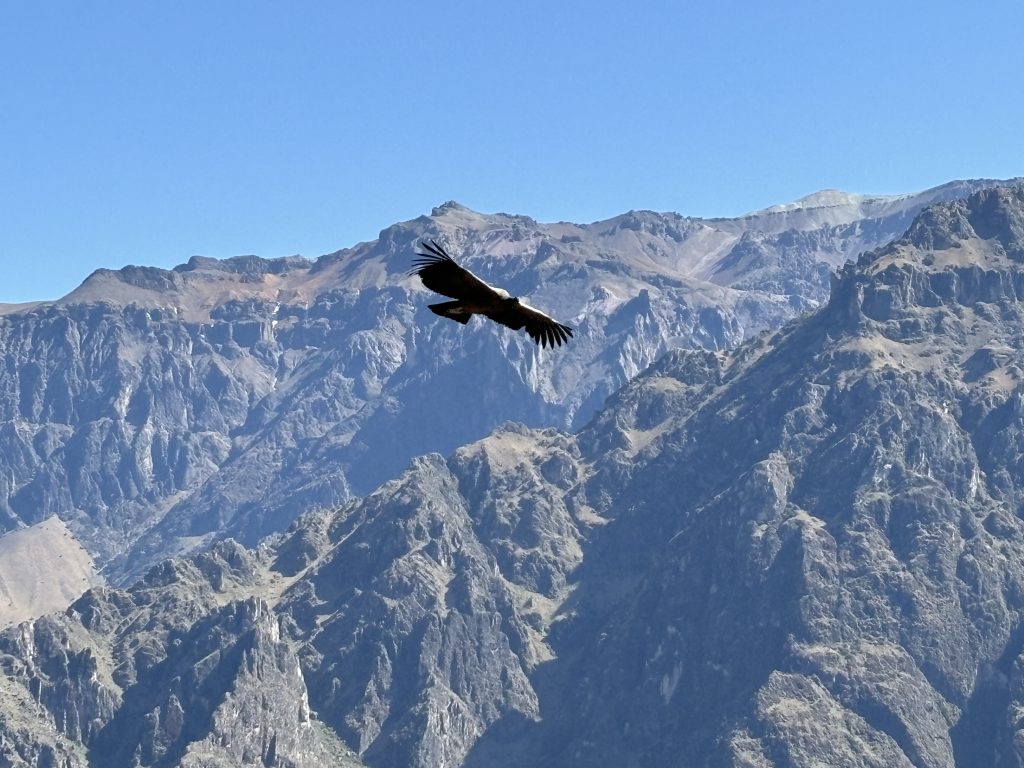Über Nacht sind wir mit dem Luxusbus in die Berge nach Arequipa auf etwa 2.300 m Höhe gefahren. Das waren 13 Stunden Busfahrt, von denen wir die meisten fast liegend schlafend verbracht haben. Trotzdem waren wir nach der Ankunft nicht völlig erholt. Der erste Blick auf die Landschaft und auf unser wunderschönes Hotel aus der Kolonialzeit sowie ein leckeres Frühstück haben unsere Stimmung noch weiter befördert.