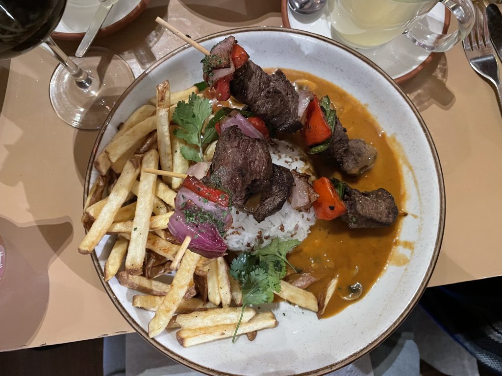 Hier gibt es die beliebtesten Fleischsorten Perus, auf dem heißen schwarzen Vulkanstein brutzelt das Fleisch weiter….