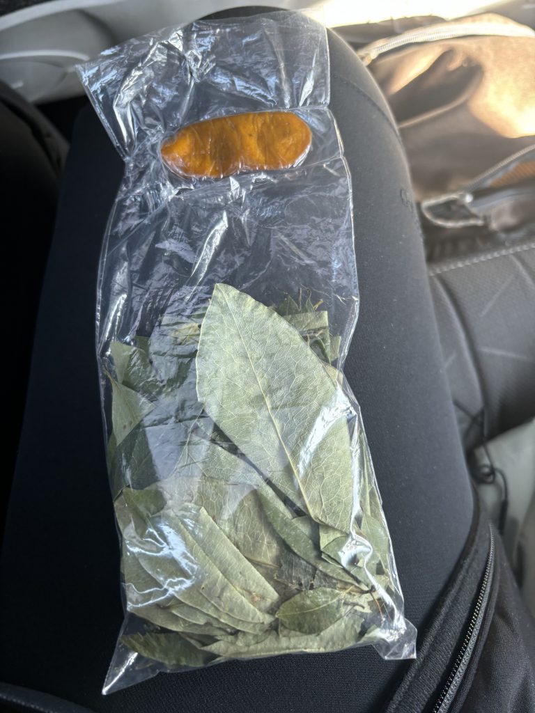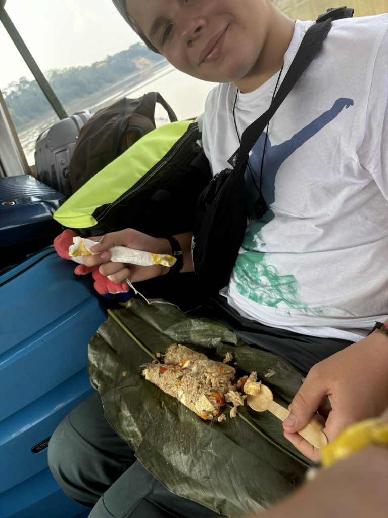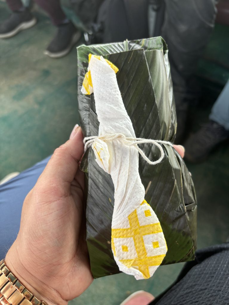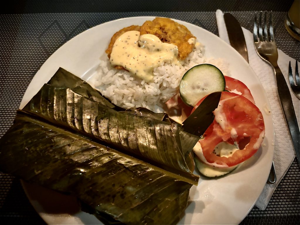 Erstmal Mittagessen – besonders nachhaltig serviert im Bananenblatt, warm und wirklich lecker, Eierreis peruanisch