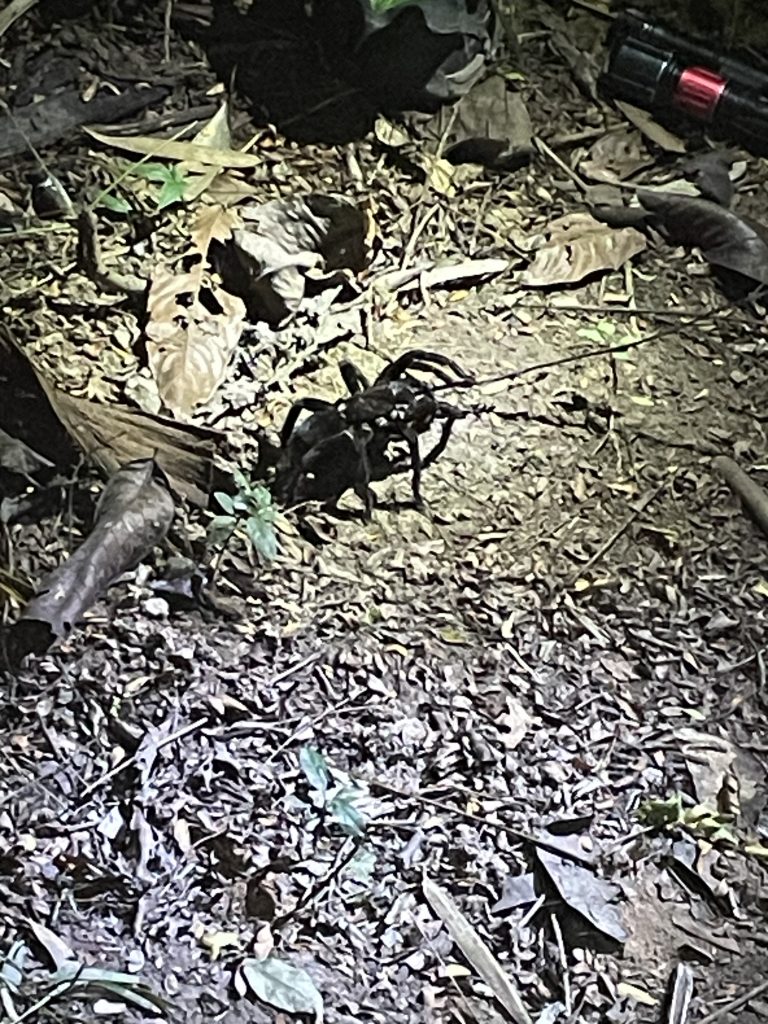 Chicken Tarantel – wenn man sie nicht ärgert, passiert nichts. Ansonsten hätte der Biss uns schon ernsthaft Schmerzen bereiten können. Schön, dass unser Guide sie nicht gestört hat: holt er sie beim Essen aus ihrem Loch 🫣