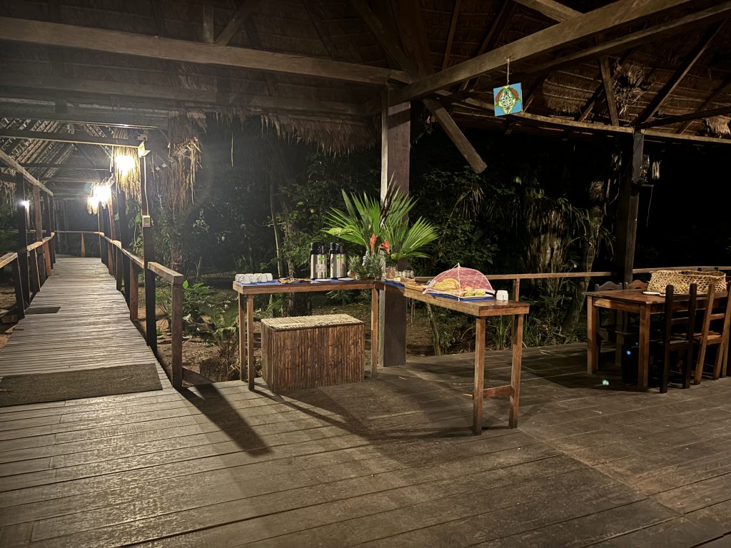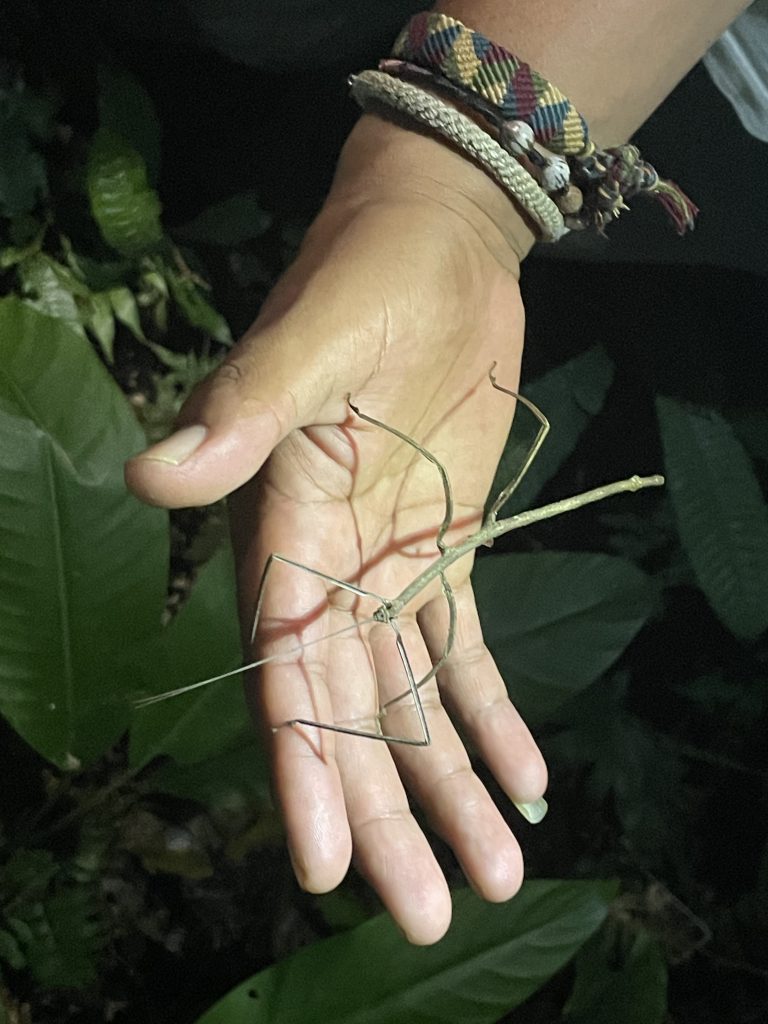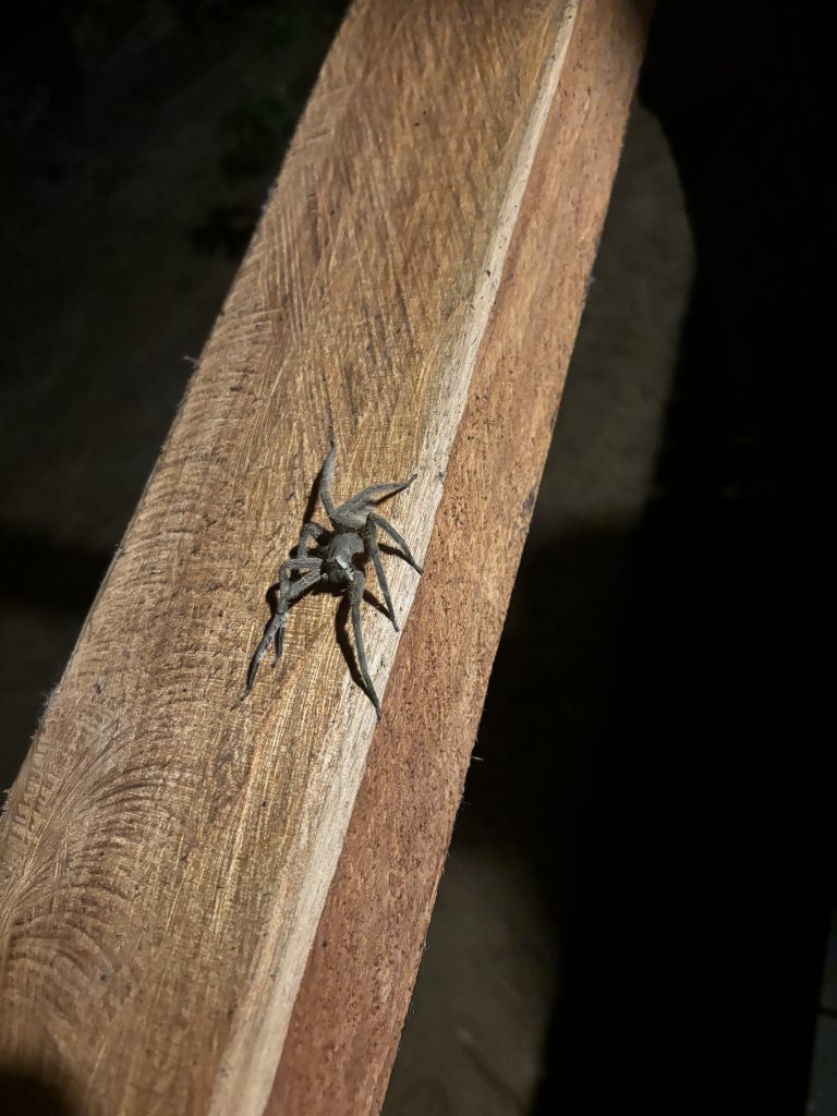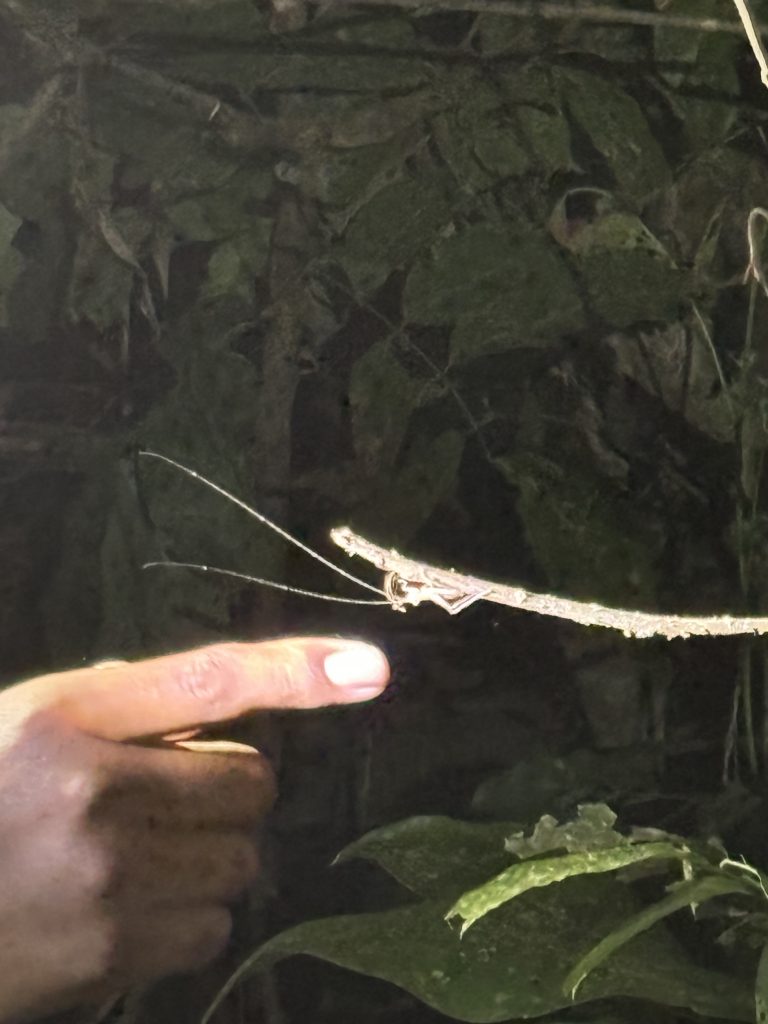 Alles offen, nur mit Gase abgedichtet! Schon erstmal komisch mit den ganzen Geräuschen. Strom gibt es (nur) zwischen 17 & 22 Uhr – zumindest so ungefähr. Dann erstmal los zur ersten Nachtwanderung: Es wird bereits vor 18 Uhr dunkel, und diesmal meinen wir wirklich dunkel. Bekleidung wird vorgegeben mit langen Shirts und Hosen, festen Schuhen und Strümpfen über die Hosen, damit nichts reinkrabbeln kann 🥴. Nachtlicht und Moskitospray sind ebenfalls Pflicht!