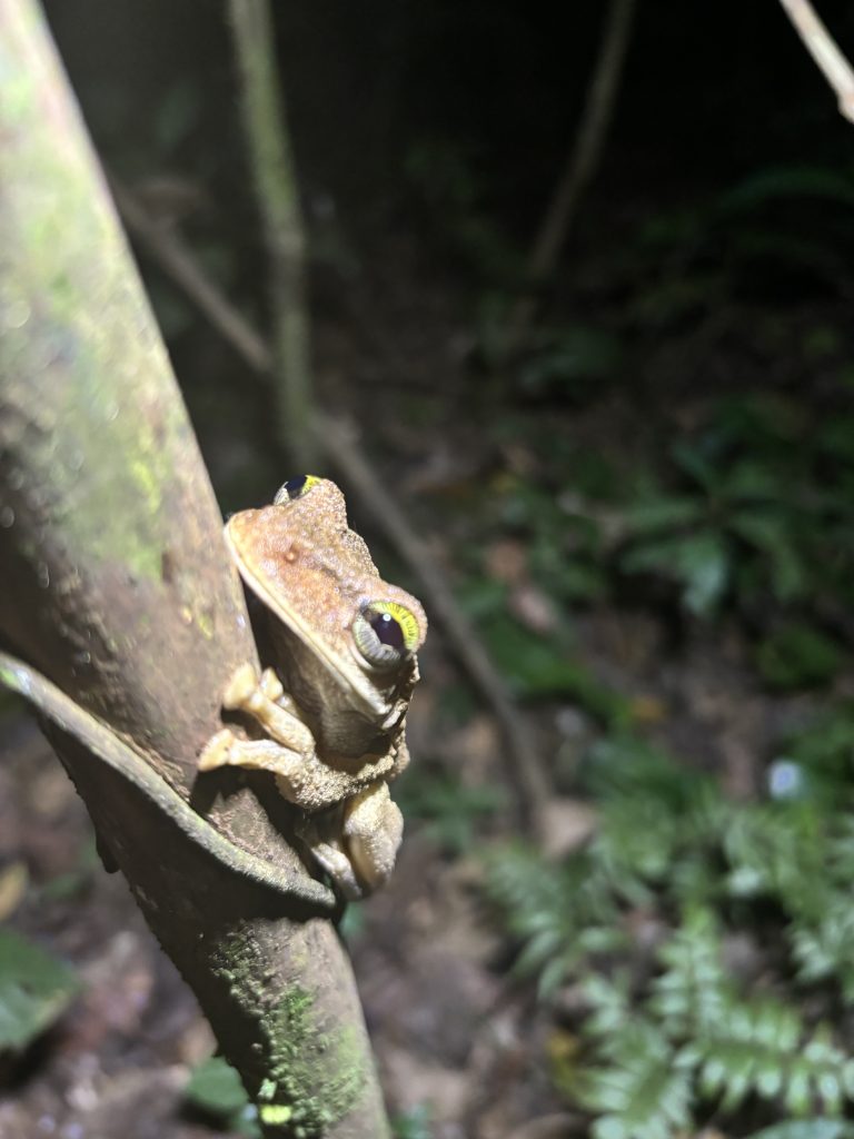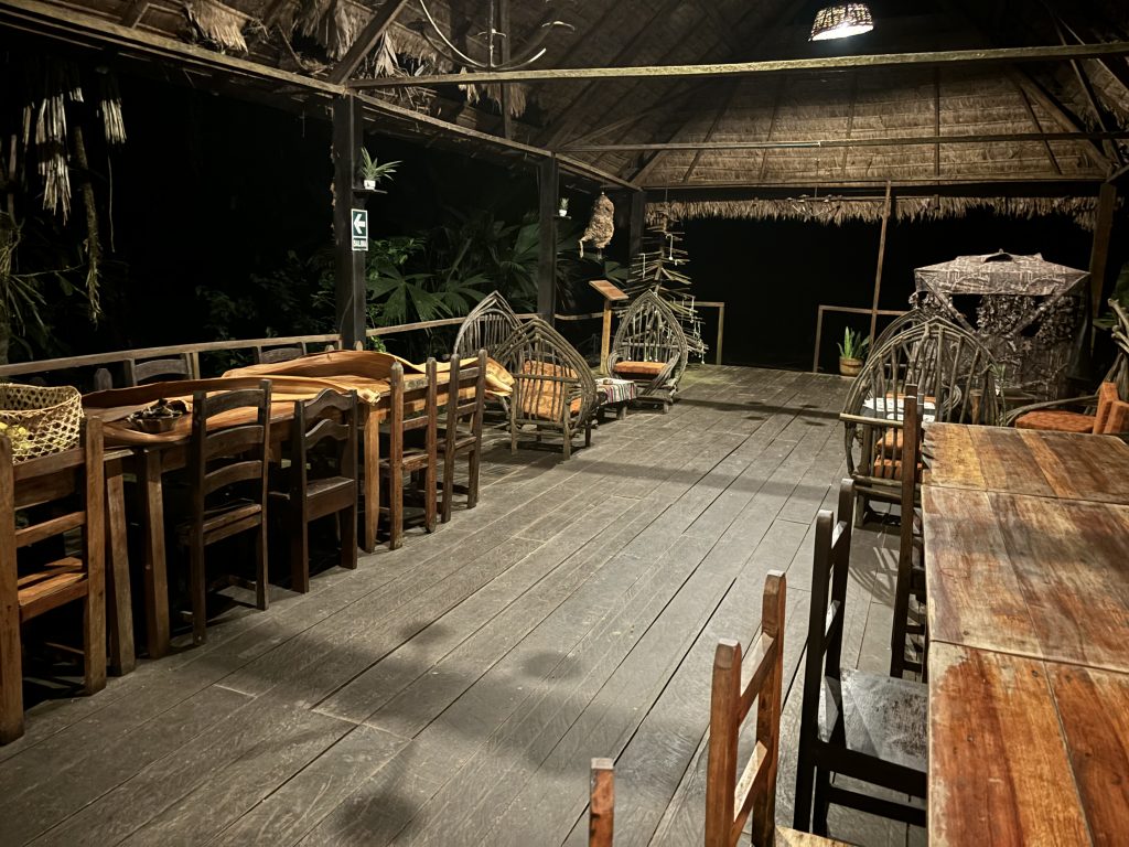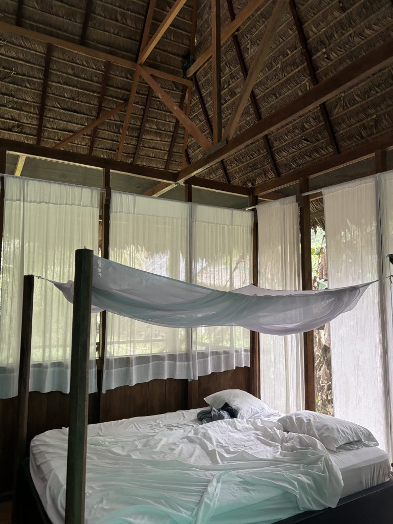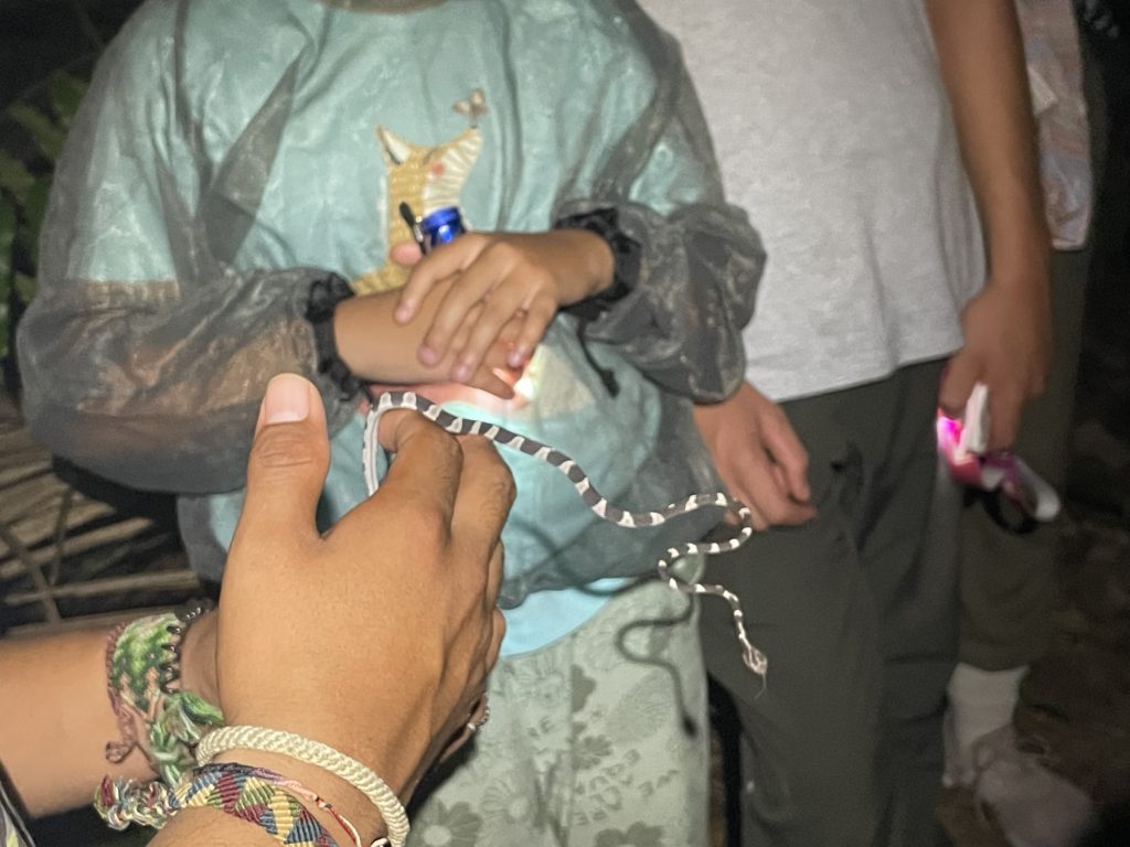 Alles offen, nur mit Gase abgedichtet! Schon erstmal komisch mit den ganzen Geräuschen. Strom gibt es (nur) zwischen 17 & 22 Uhr – zumindest so ungefähr. Dann erstmal los zur ersten Nachtwanderung: Es wird bereits vor 18 Uhr dunkel, und diesmal meinen wir wirklich dunkel. Bekleidung wird vorgegeben mit langen Shirts und Hosen, festen Schuhen und Strümpfen über die Hosen, damit nichts reinkrabbeln kann 🥴. Nachtlicht und Moskitospray sind ebenfalls Pflicht!
