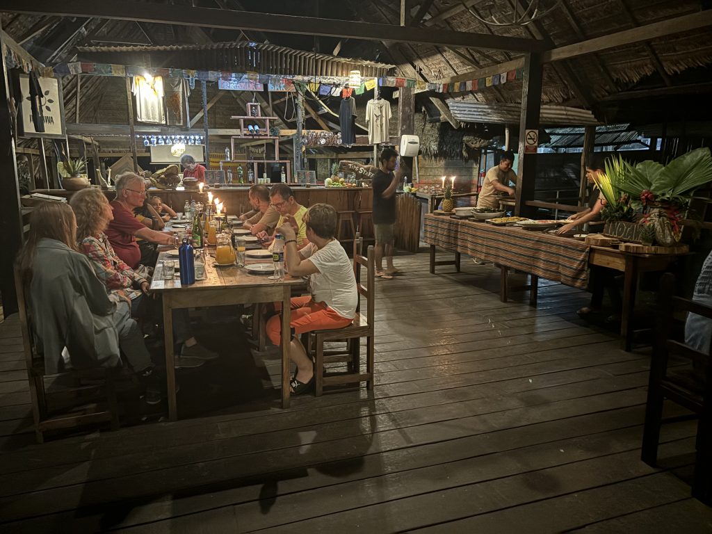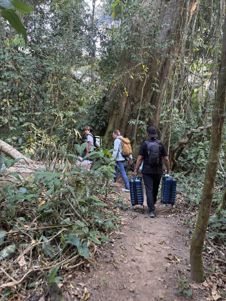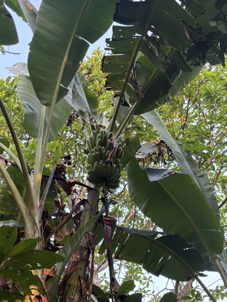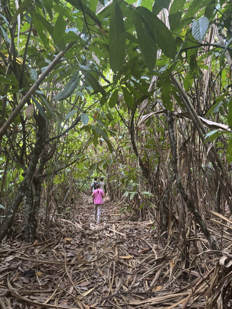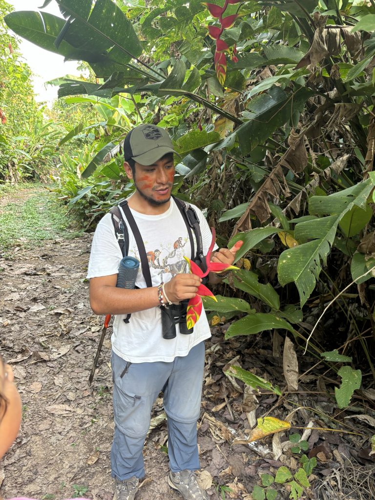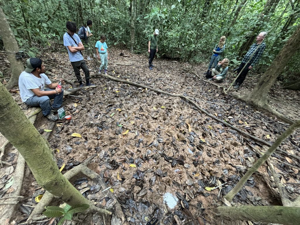 Zunächst das Positive: Essen und Freundlichkeit wie immer top, wenn auch anders. Hans ist völlig hin und weg und ist ganz vernarrt in unseren Guide Bryan. Er bringt ihm deutsche Vokabeln bei, sie tauschen sich über Musik und Fußball aus – herrlich. Und: Aufstehen erst um 7:30 Uhr, also fast ausschlafen. Das nicht so schöne: weiterhin 33 Grad bei hoher Luftfeuchtigkeit, man kommt aus dem kalt Duschen nicht raus. Wir treffen uns um 9:45 Uhr zum Plant Trail – wieder in voller Montur, was aber auch egal ist, weil alle Sachen eh leicht klamm sind und kleben.