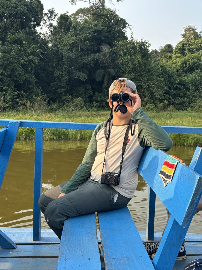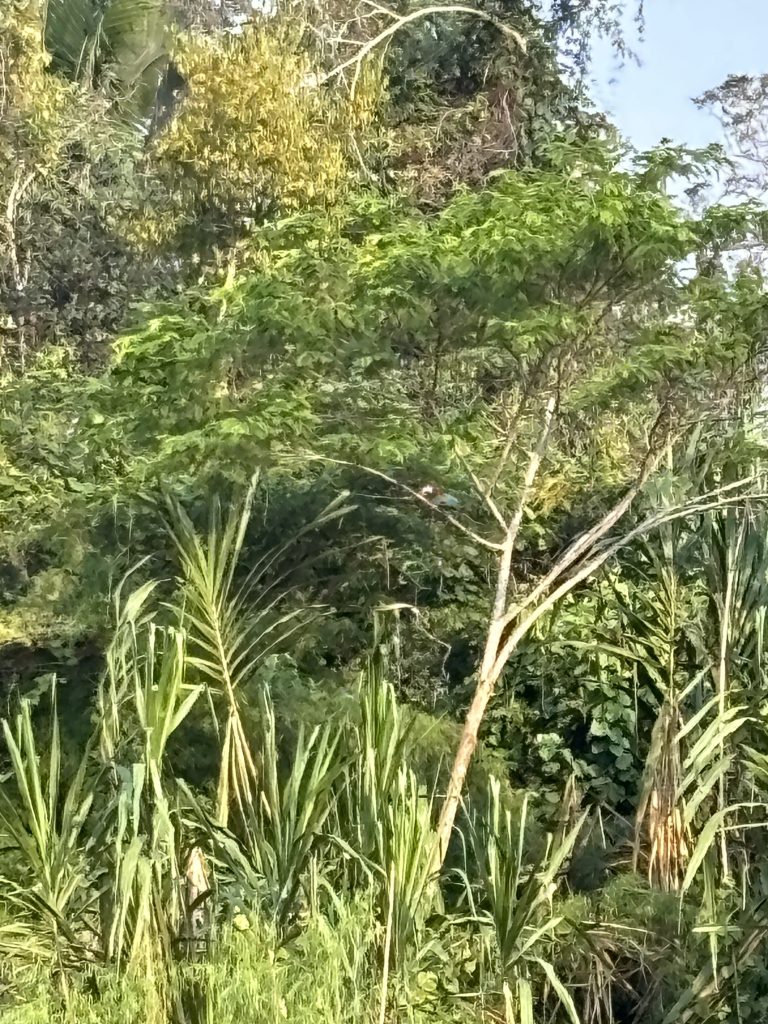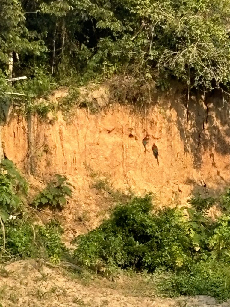 Der letzte Morgen im Dschungel: Aufstehen heute kurz vor 5 Uhr, wir wollten mit dem Boot noch zum Socializing Platz der großen Aras. Und tatsächlich haben wir 2 in Rot ganz gut erkennen können.