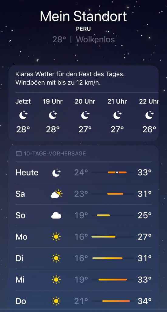 Auf jeden Fall jede Menge von Eindrücken, Bildern, Widersprüchen, Überraschungen, Sichtweisen, die unserer Lebensweise manchmal komplett widersprüchlich erscheint. Man könnte meinen, dass das Land arm sei mit vielen sehr heruntergekommenen Hütten. Tatsächlich haben wir kaum Bettler oder Obdachlose gesehen. Stattdessen waren die Peruaner unaufgeregt stolz auf ihr Land, offen uns gegenüber, viele kannten Deutschland und besuchten sogar die deutschen Schulen Perus. Mit all der Sonne und den wunderbaren Früchten und Gemüsen könnte das Land sehr reich sein. Schade, dass im Sinne der Nachhaltigkeit aber noch eine Menge passieren muss – kaum Solar und überall entsorgt man den Abfall, teilweise sogar im Naturschutzgebiet.