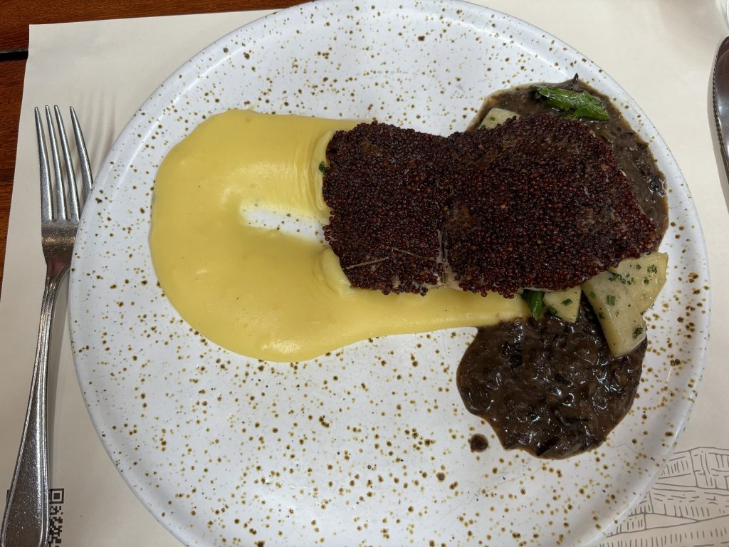 Seebrasse in Chinoa Kruste auf Süsskartoffel und weißem/grünen Spargel